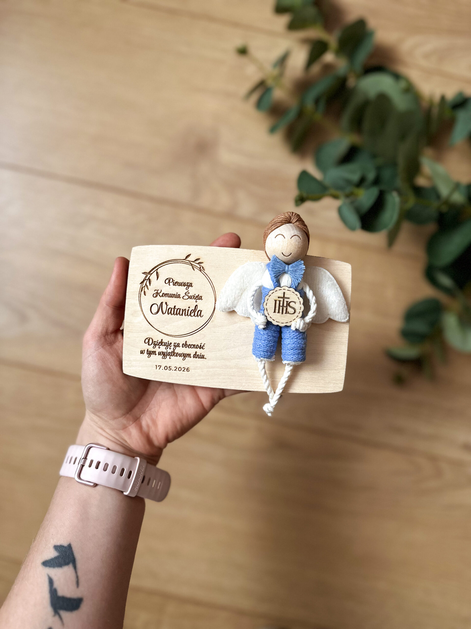Podziękowania dla gości komunijnych – magnes – aniołek niebieski chłopiec